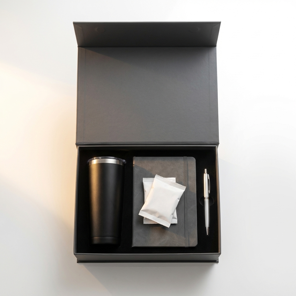 Curated gift box with tumbler, notebook, pen, and sticker set in a custom rigid box with magnetic closure.