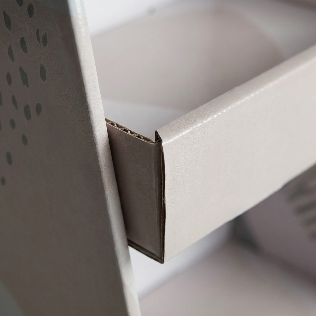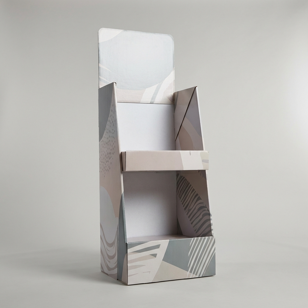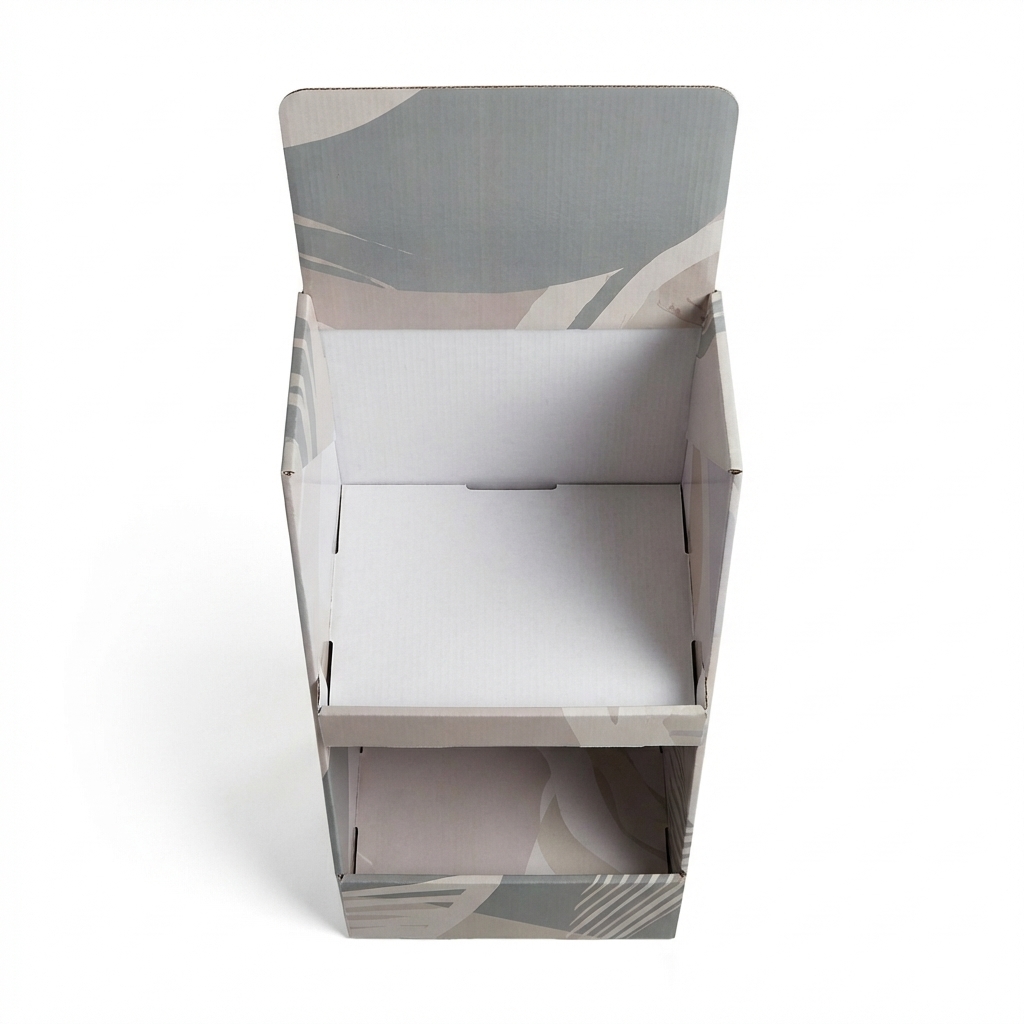 B-flute corrugated PDQ countertop display with 2 tiers (5 lb per tier, load-tested). Full-color litho-laminate.