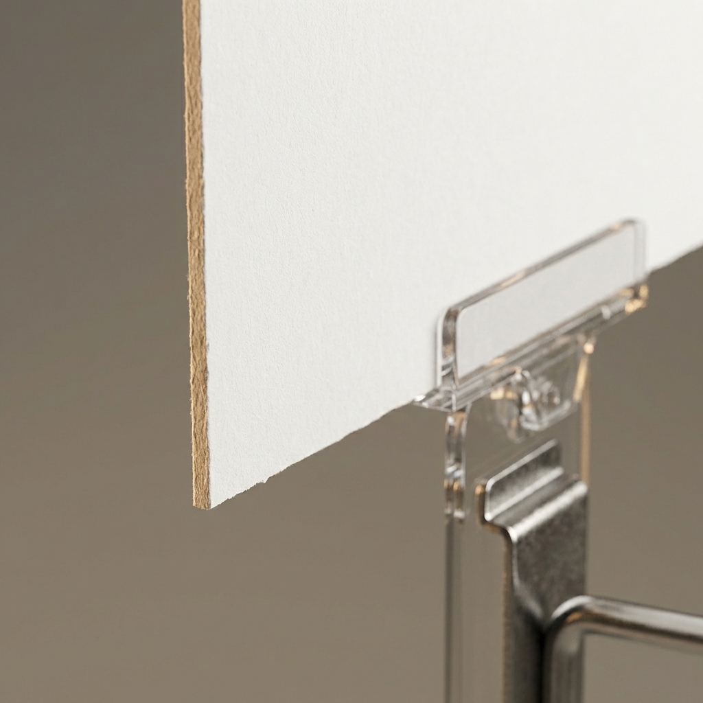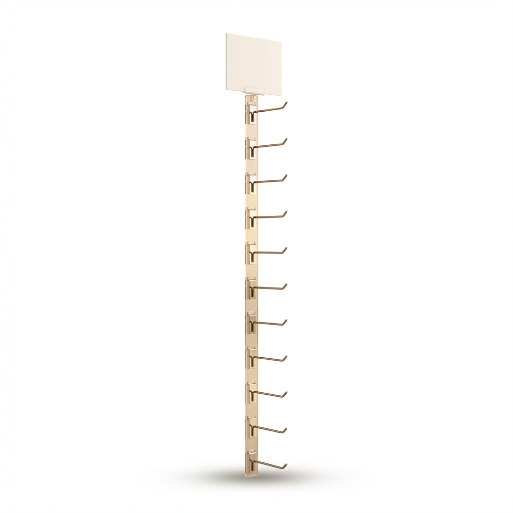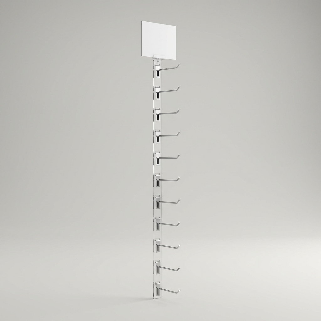 Point-of-purchase clip strip with 12 hooks and branded header card. Mounts on shelf edges or endcaps.
