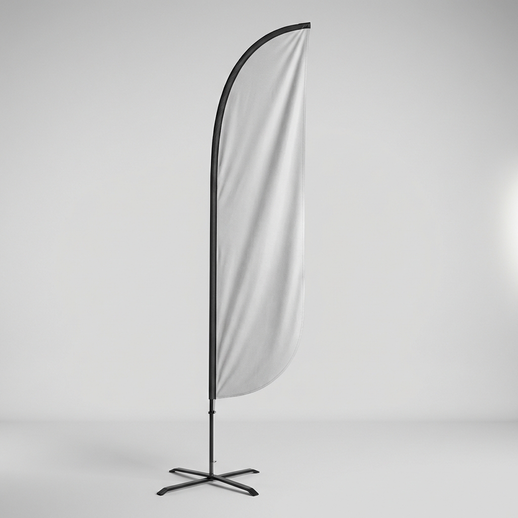 Custom 12-foot feather flag with fiberglass pole, ground spike, and cross base. Dye-sublimation printed polyester.
