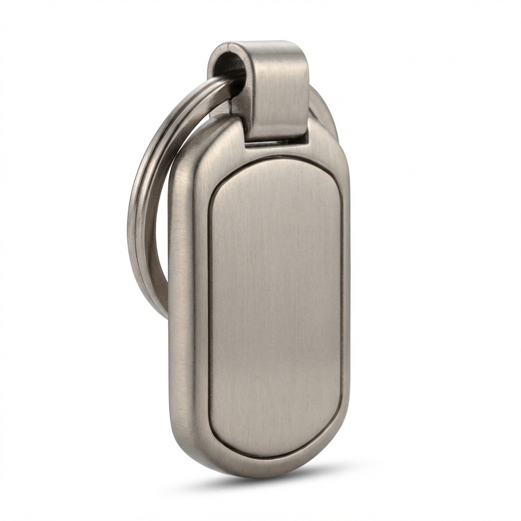 Die-cast zinc alloy keychain (35-40g) with satin nickel plating and laser-engraved logo. Permanent mark, no fading.