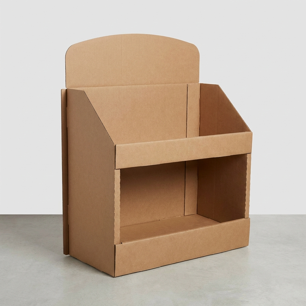 Low-profile end-cap tray display with branded header. Designed for grab-and-go products. B-flute corrugated.