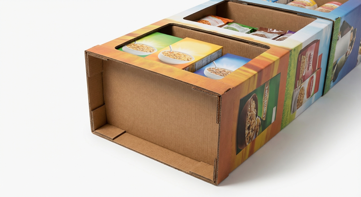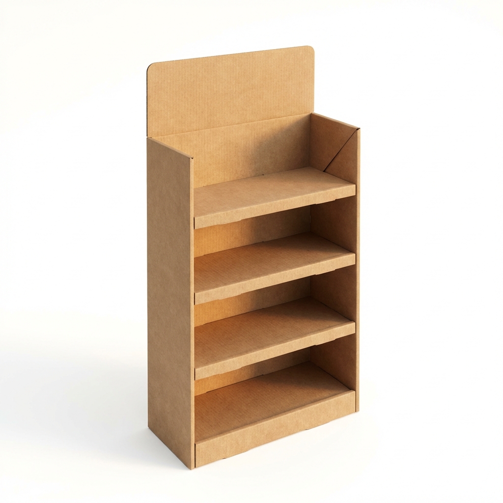 Double-wall corrugated FSDU with 4 shelves (15 lb each, load-tested at 1.5x). Ships flat, tool-free assembly.