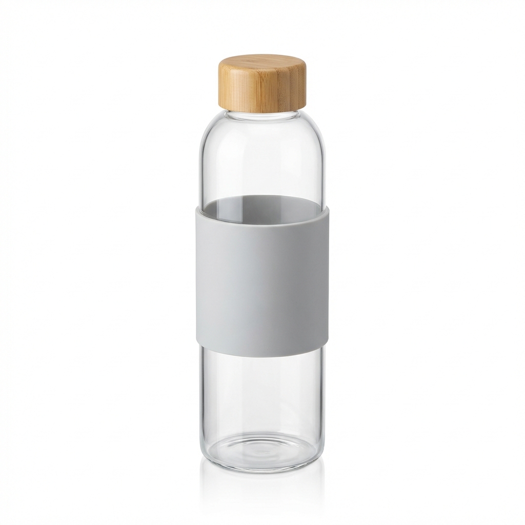 Borosilicate glass bottle (18 oz) with bamboo screw cap and silicone sleeve. Laser-engraved or UV printed logo.
