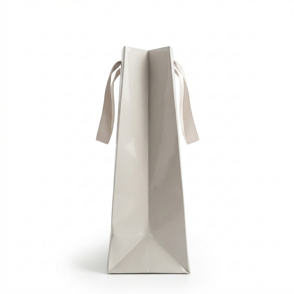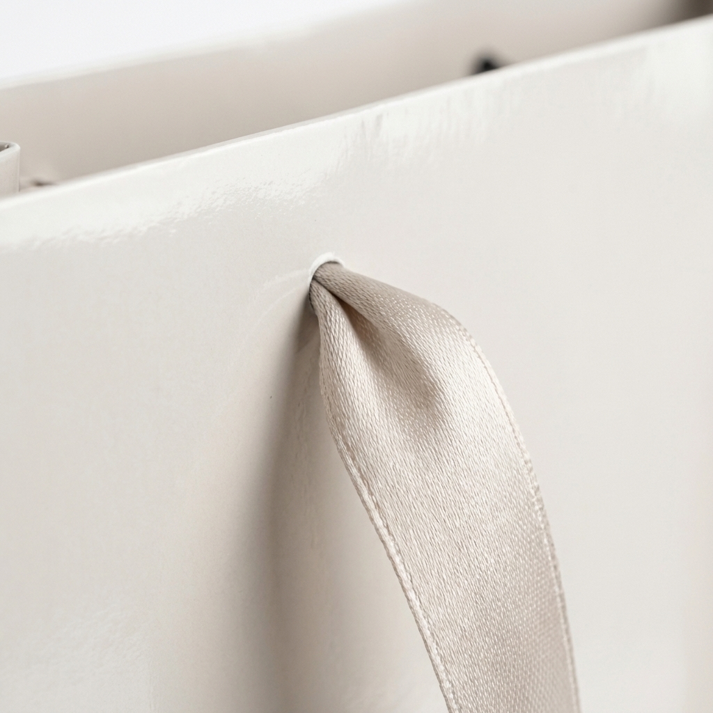 High-gloss laminated paper gift bag with satin ribbon handles. Full-color printing, 3 sizes available.