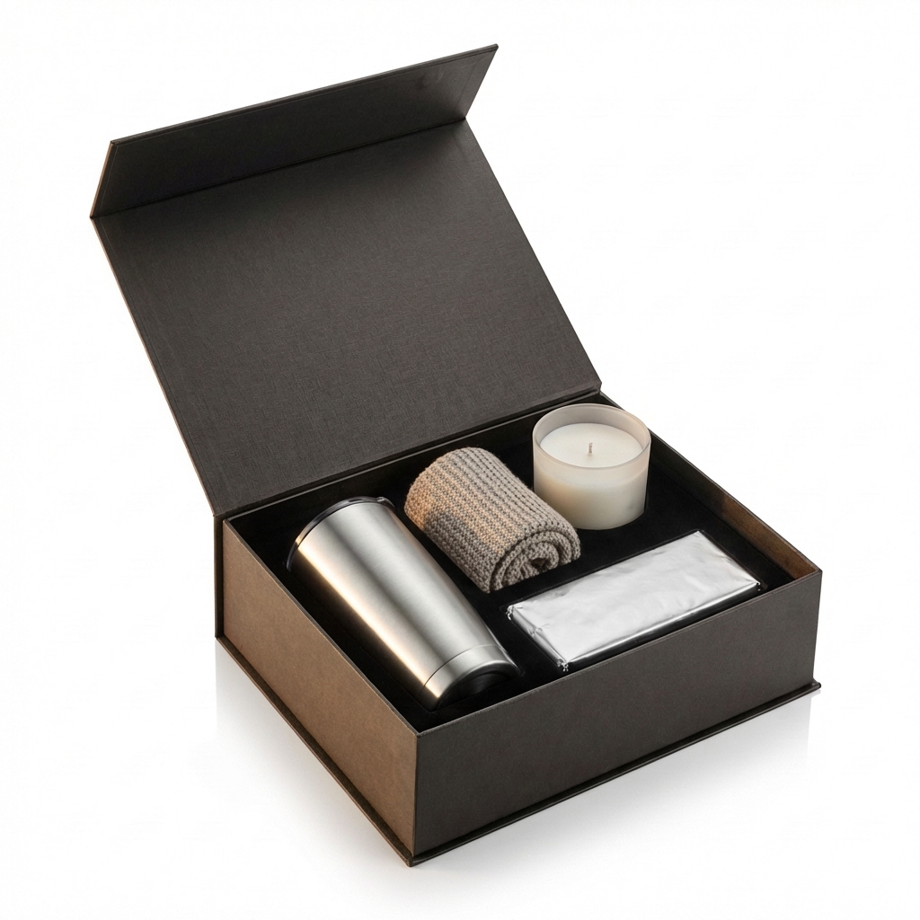 Premium holiday gift box with branded tumbler, scarf, candle, and chocolate bar in a magnetic-close box.