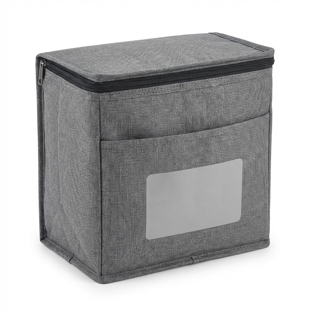 Branded insulated lunch tote with zippered closure and front pocket. Full-color heat transfer imprint.