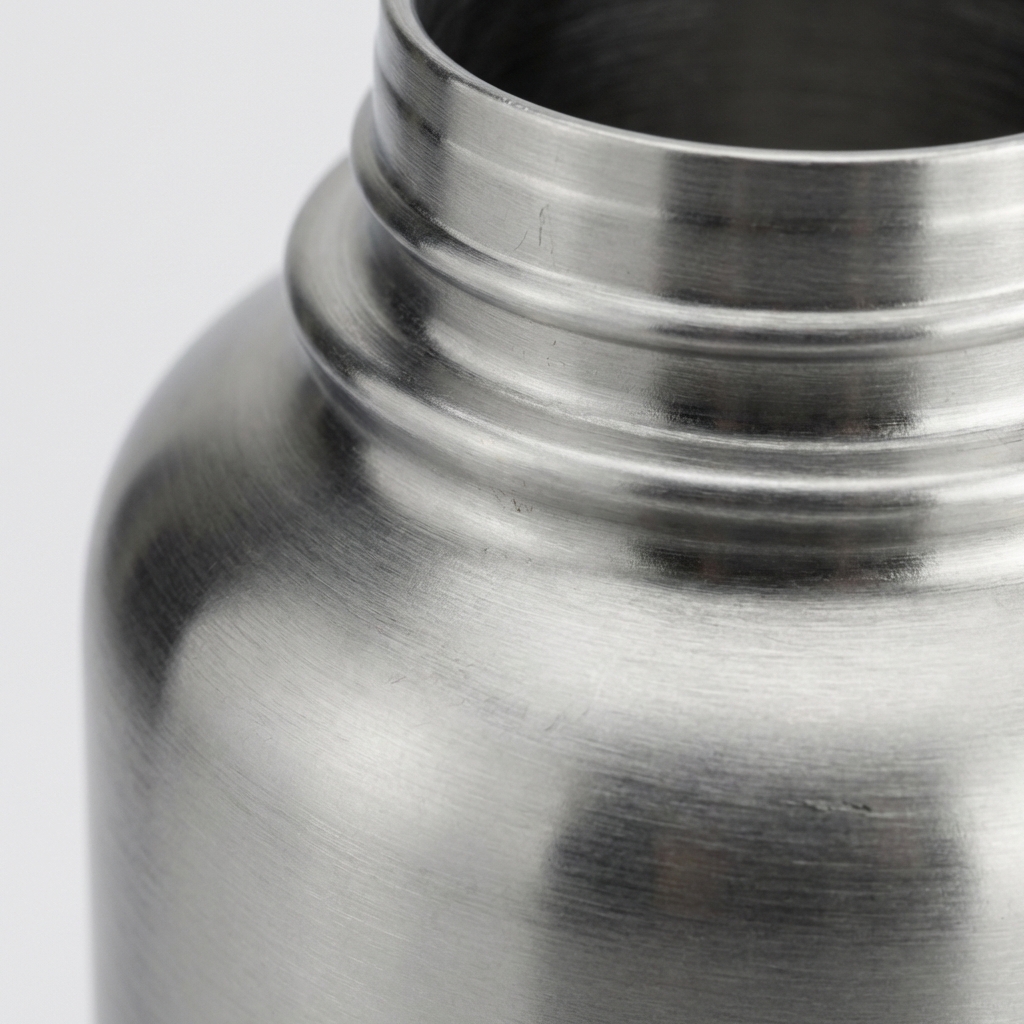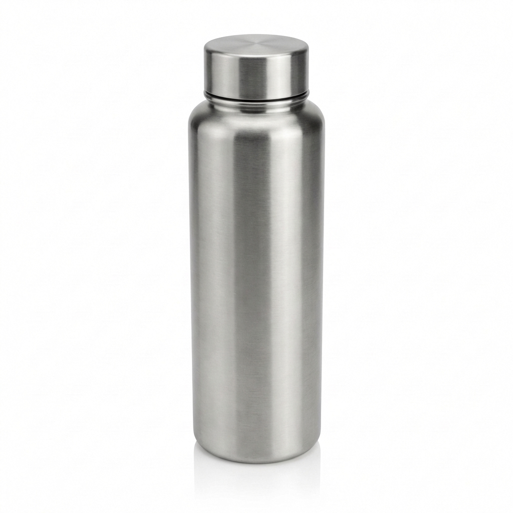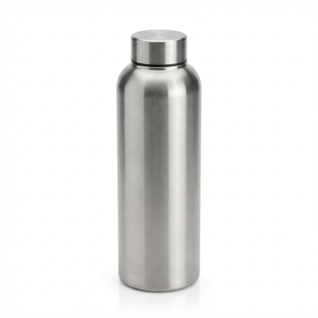 24 oz double-wall insulated water bottle with screw-top lid and laser-engraved logo. Stainless steel.