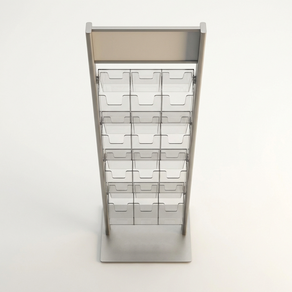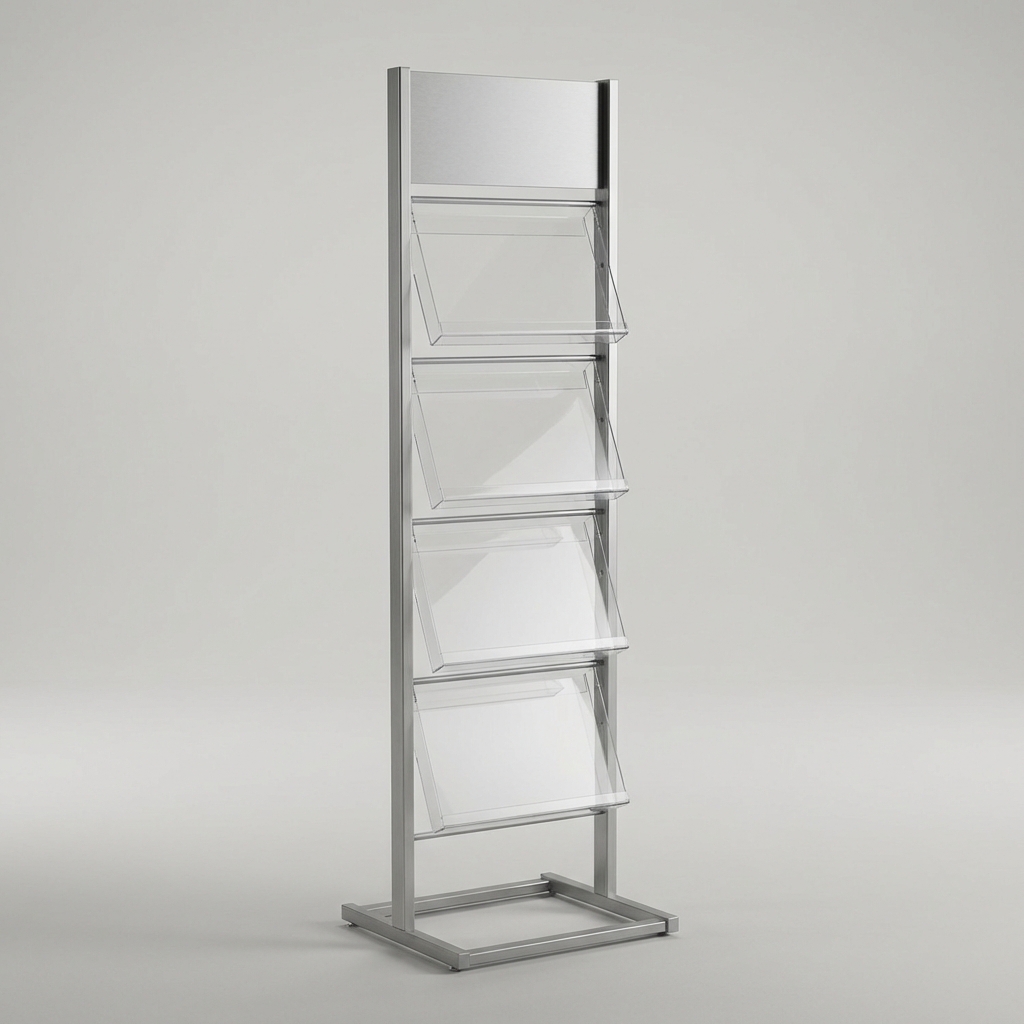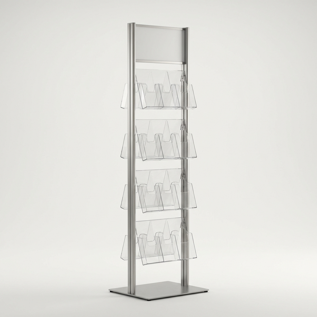 Freestanding brochure holder with 4 pockets and branded header. Acrylic pockets on metal stand, 58" tall.