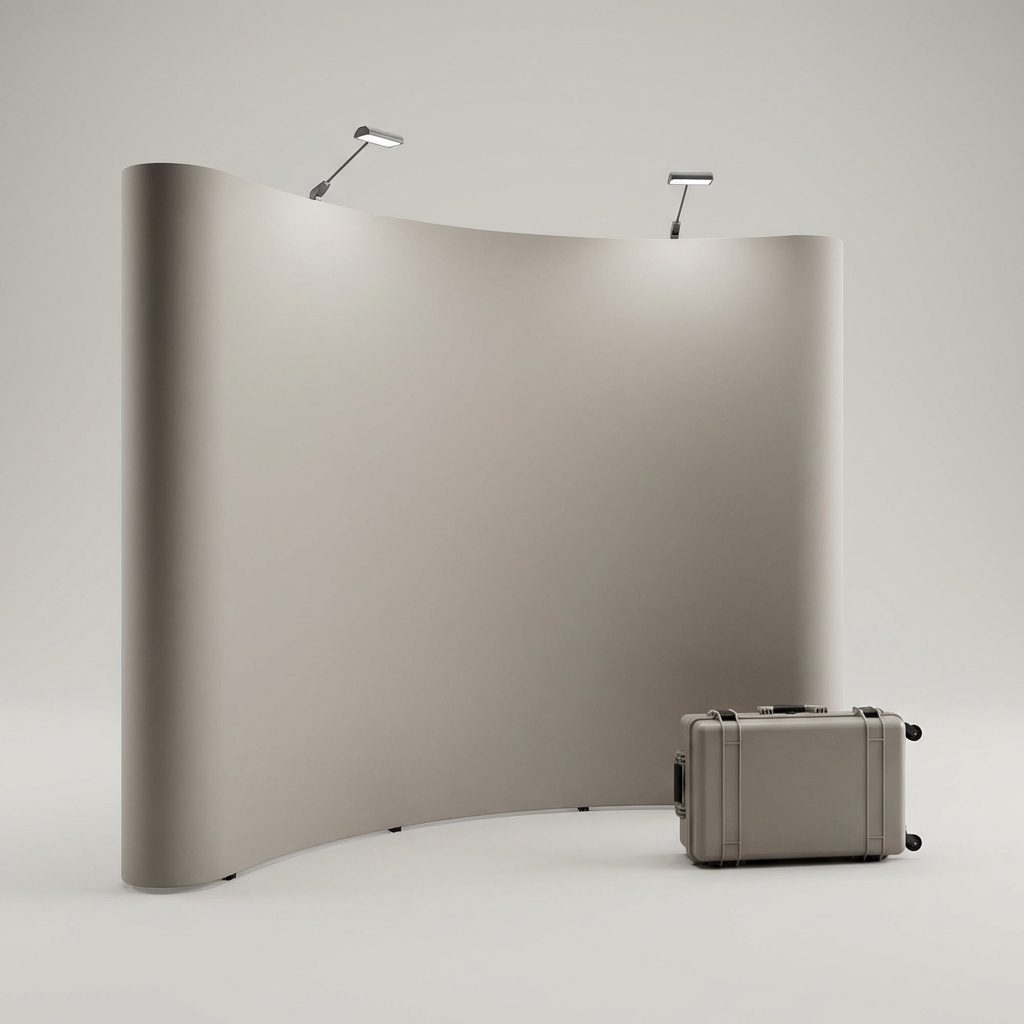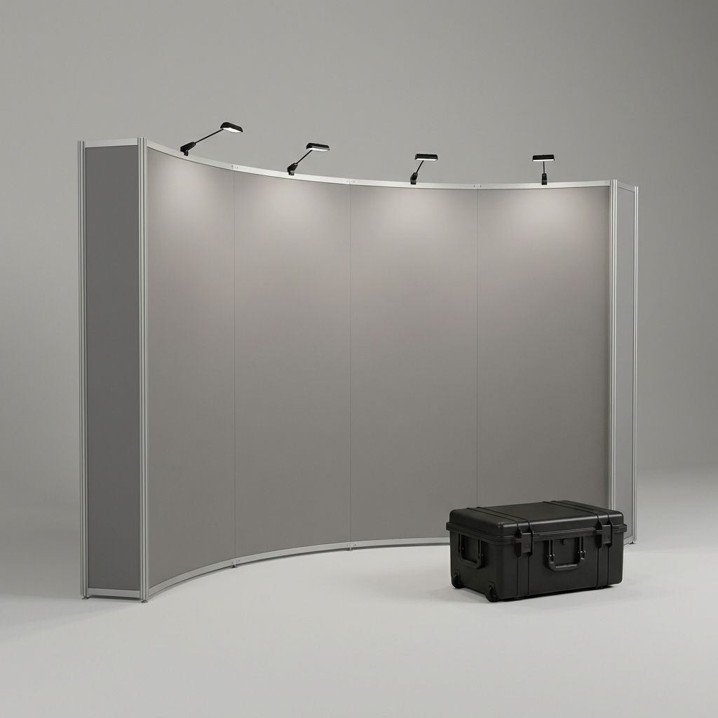 Curved 10-foot pop-up booth display with magnetic-attach fabric panels. Includes LED lights and wheeled case.