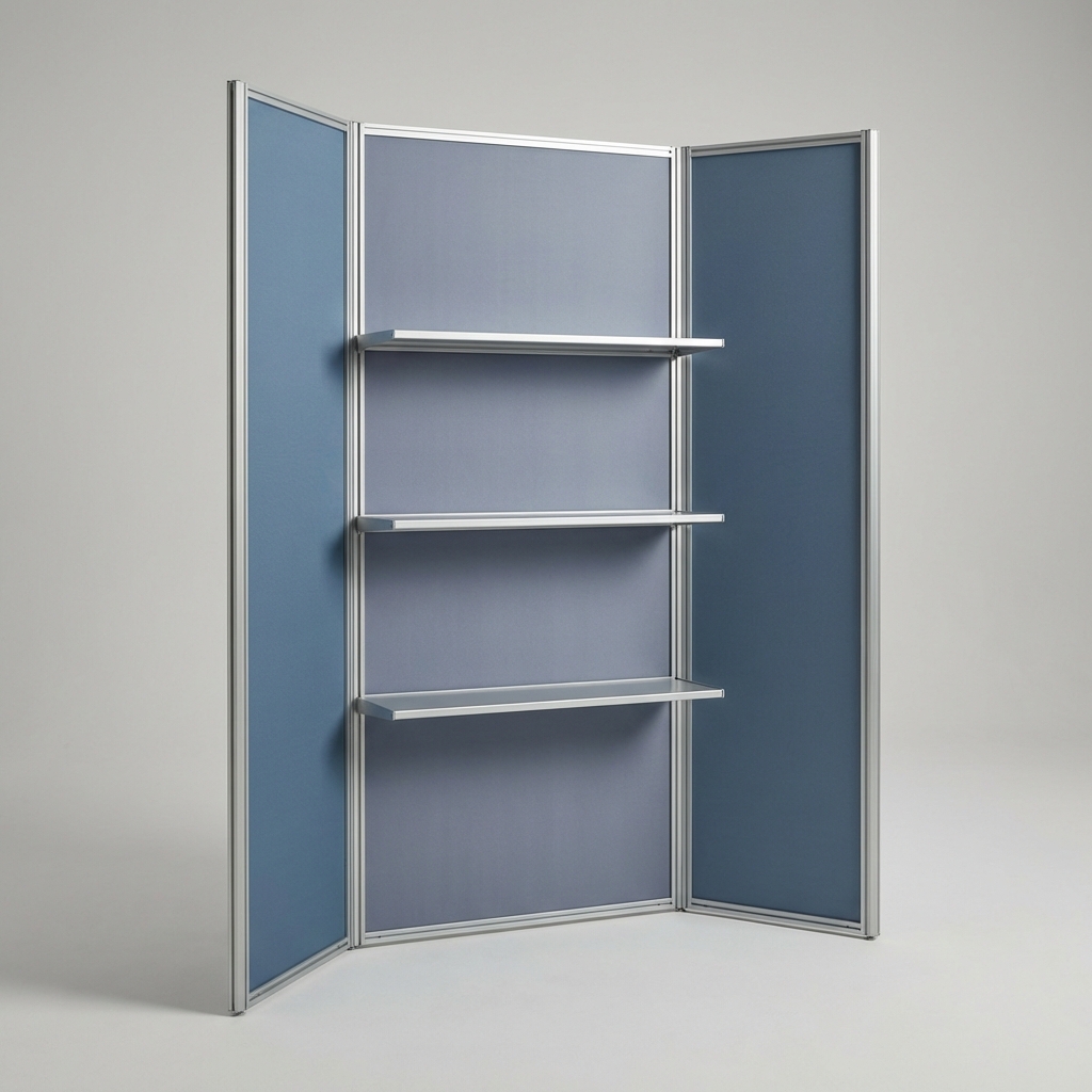 Tri-panel tabletop display with full-color fabric graphics and aluminum frame. Folds into included carry bag.