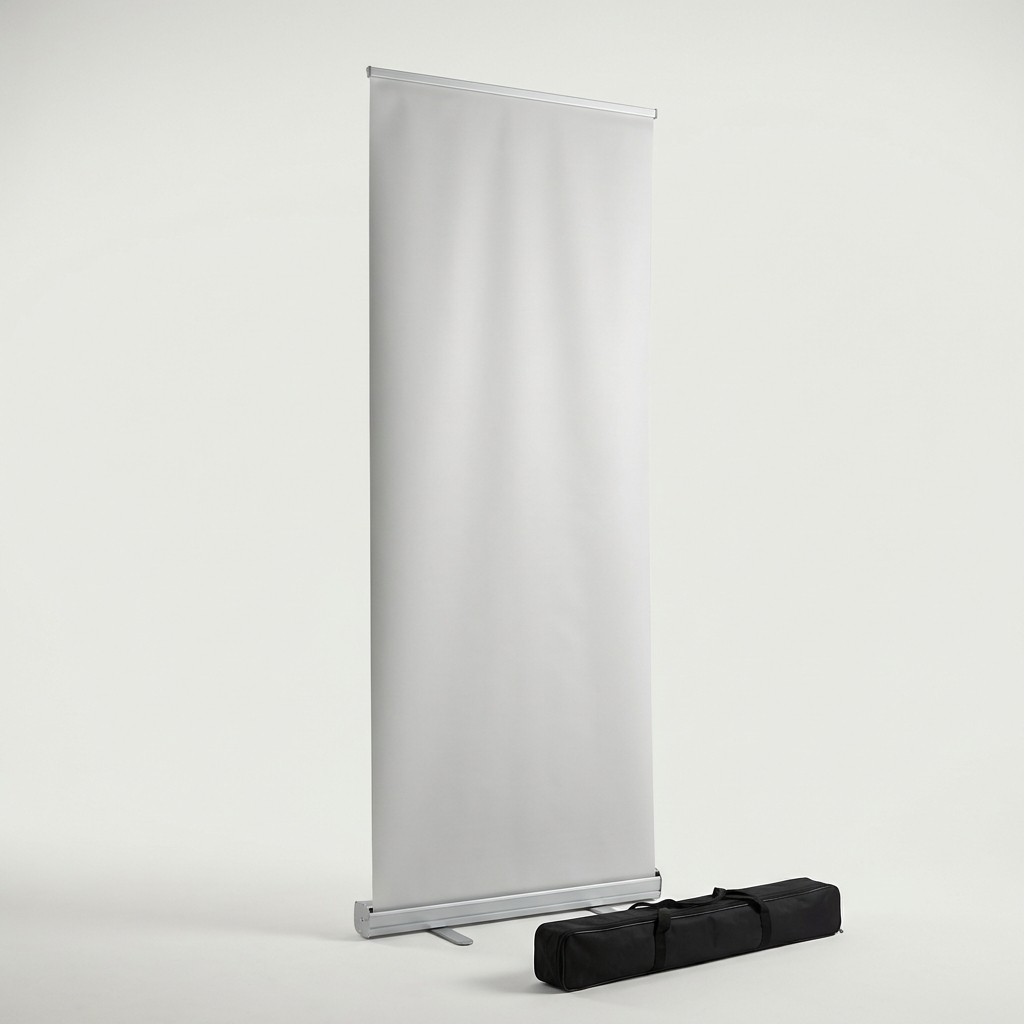 Portable retractable banner with 33" x 81" vinyl graphic and aluminum base. Includes padded carrying case.