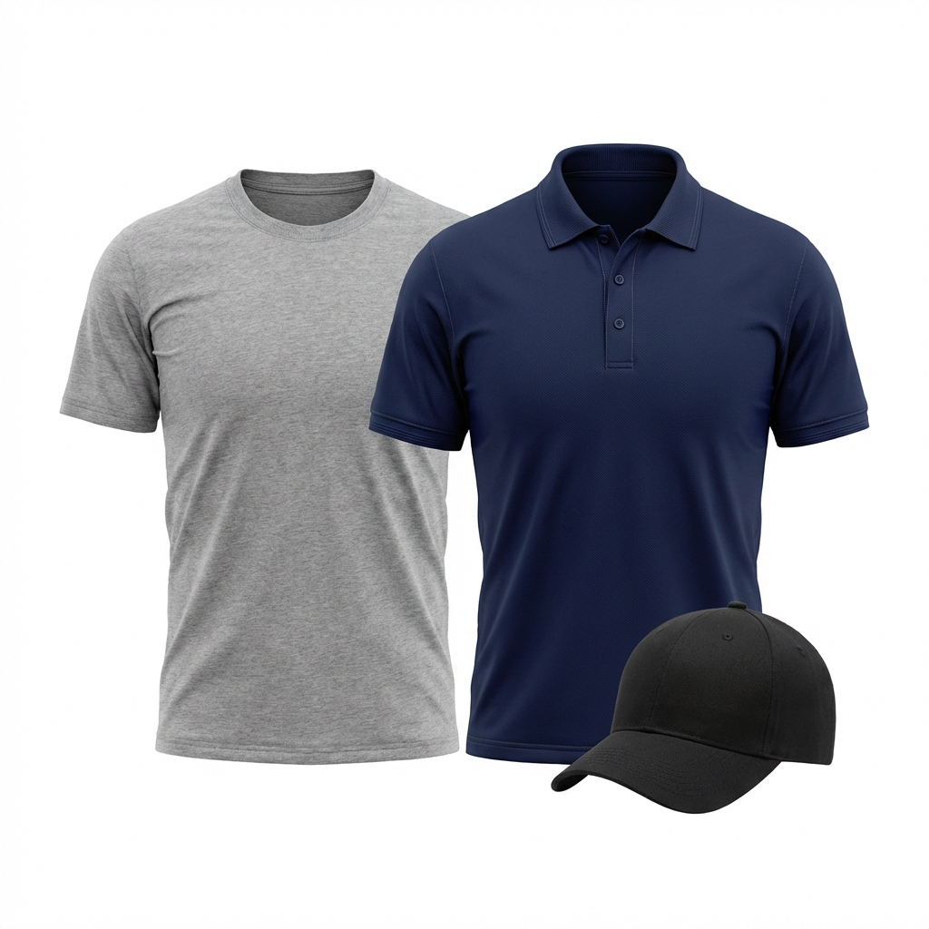 One t-shirt, one polo, and one cap — all with your embroidered or printed logo. A starter set for any team.