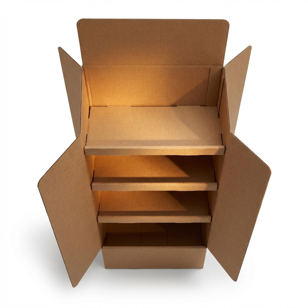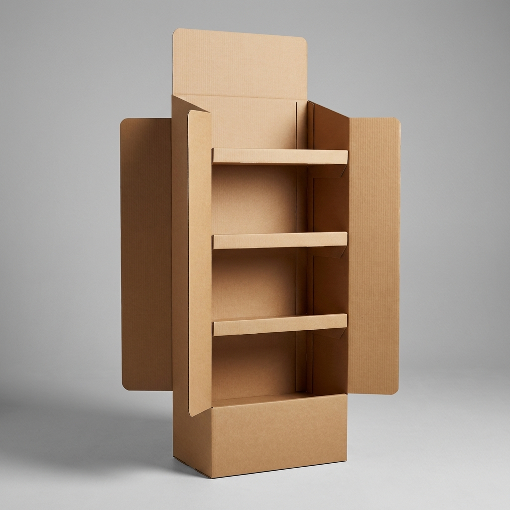 End-cap display with fold-out wing panels for extended branding surface. Double-wall corrugated, 4 shelves.