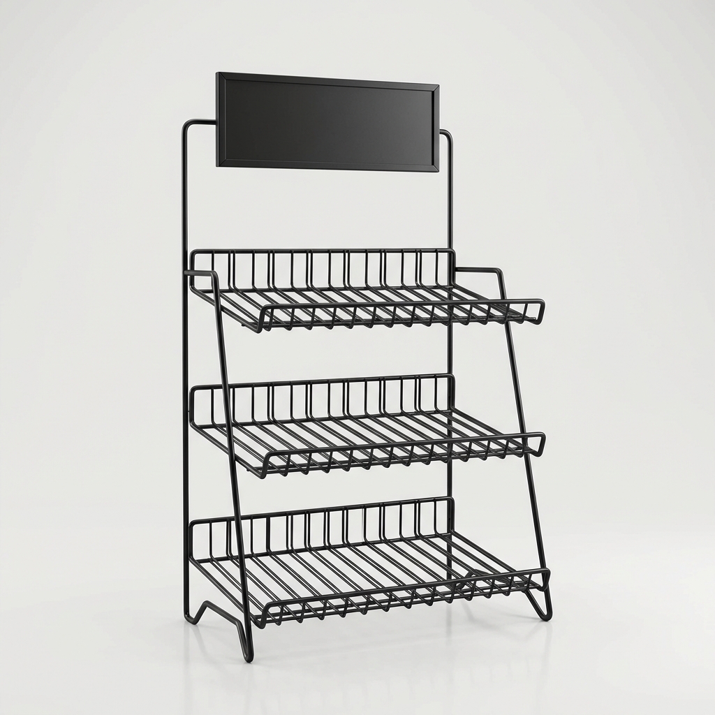 Powder-coated wire display rack for countertops. 3 tiers, branded sign holder, holds up to 25 lbs total.